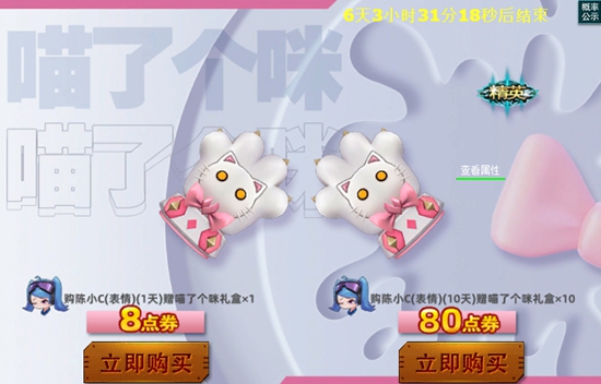 【活动细则】活动期间购买“陈小C”表情,即可获得“喵了个咪礼盒”一个。买10天表情送10个礼盒。