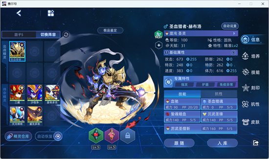 | 不屈斗魂 | 属性攻击 | -- | 5 | 57 | 必中;全属性+1,若自身当前体力低于对手则强化效果翻倍;4回合内每回合使用技能吸取对手最大体力的1/3;下2回合令自身所有技能先制+2 | |