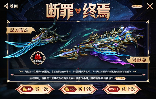 2、每打开一次断罪·终焉礼包,幸运值都会有所增长,幸运值达到满值时,下一次打开断罪·终焉礼包必得断罪晶石*1;