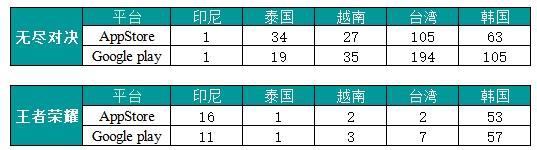 再来看看《王者荣耀》的重点推广市场和《无尽对决》畅销榜成绩对比: