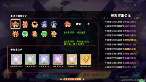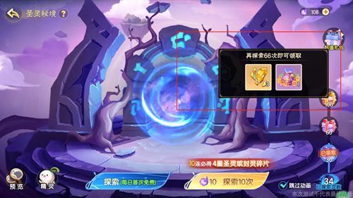 左下角预览可以查看不同星级圣灵的获得概率,右侧是已探索的次数,累计一定次数可以获得对应奖励、四星自选圣灵、圣灵经验、圣灵碎片等奖励。用于后续圣灵的培养和提升