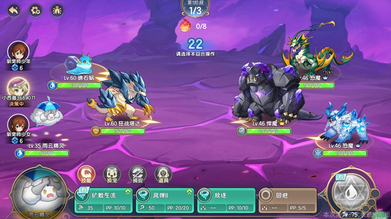 精灵上场以后要在规定的30秒内选择本回合的操作,每个阶段的战斗一共有三个回合,将敌方精灵/传送门击败后,可以获得收集物(就是秒数上方的小火苗),第一阶段需要收集8个小火苗,一定要在3回合结束前收集齐,否则将挑战失败。