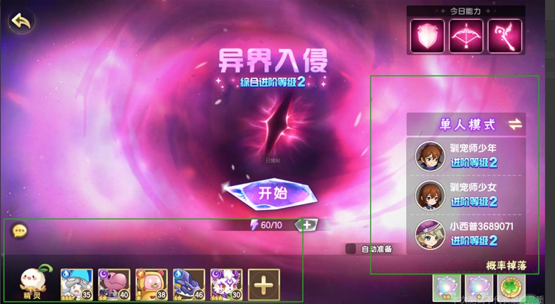 右上角是今日异界入侵可能会遇到的能力,为什么说是可能会遇到的能力呢?因为在进入战斗以后,会随机将三个能力分配给三个人,