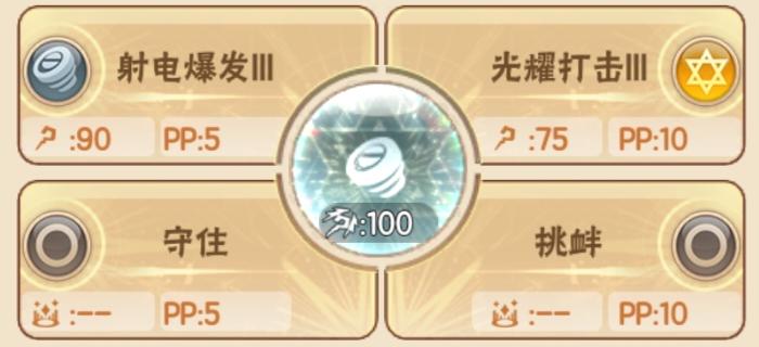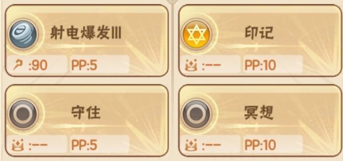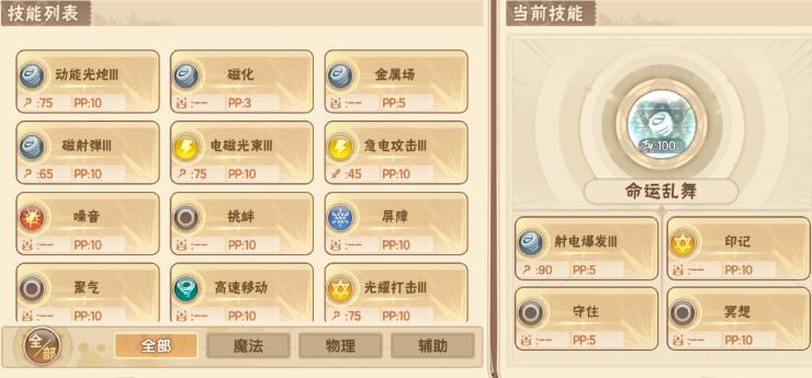 辅助技能解析:有守住挑衅在竞技场里就有了一席之地,守住可以预判对手大招,增加生存能力,挑衅可以防止对手使用辅助技能,是竞技场里一个非常好用的技能冥想和印记说明命运在PVE上也是不虚的攻击技能解析:射电爆发拥有很高的技能威力,如果专属潜能刷的好是可以到100的技能威力的。同时射电拥有25%的概率麻痹对手,如果运气好的话可以拿到一两回合的优势。光耀打击可以预判对手切永夜,切记不要贪伤害。同时有25%的概率提升一级魔攻,适用性不强,如果害怕永夜可以带一手。(这个技能需要通过技能石来学,技能石在暴风王配件室里,接完电路就可以拿了)电磁光束这个技能带的人比较少,因为现在电系精灵也不少,有狼王黄蝎红蝎,并且该技能的附加效果是25%的几率磁化,所以这个技能相对来说比较鸡肋最后是大招