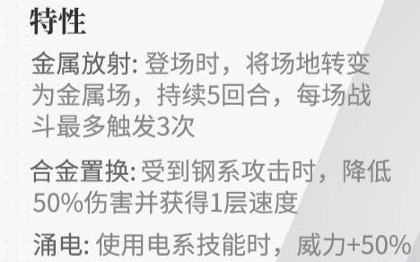 金属放射:将场地变为金属场,持续五回合,每场战斗最多三次