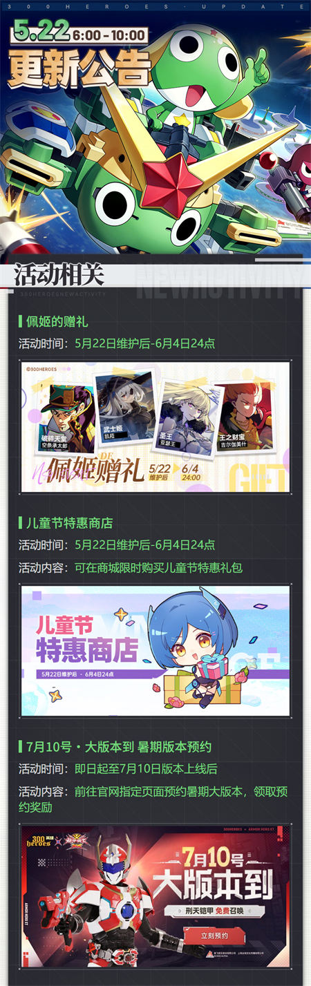 《300英雄》将于2025年5月22日6:00-10:00(星期四),对所有大区进行停机更新,更新期间,您将无法登录游戏。如果在预定时间内无法完成维护内容,开服时间也将继续顺延。
