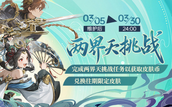 3月的两界天赛事也将如期开放,新一期两界天挑战也同步开启,活动期间完成当月两界天挑战任务获取皮肤币,该道具可用于兑换限定皮肤;累计个人积分还可获取其他积分进度奖励。