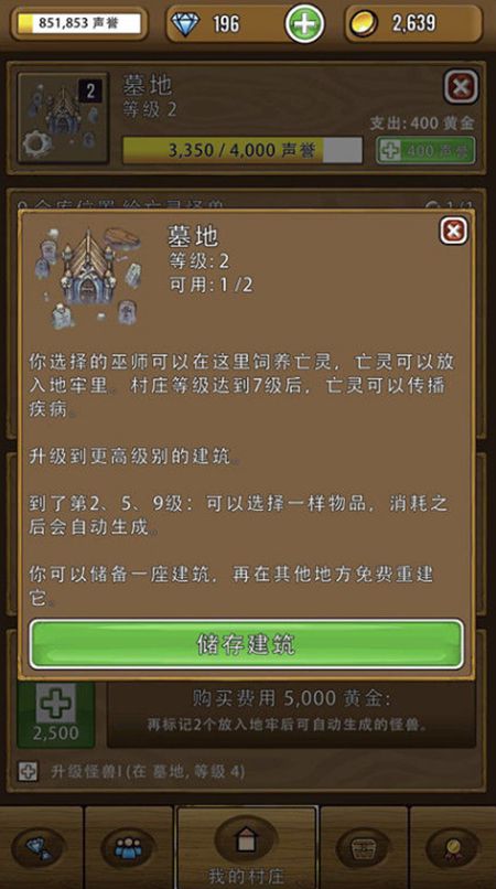 首选你需要建造一个建筑——墓地,在墓地中你可以饲养亡灵,亡灵可以放到地牢里或者被诅咒的地下室中。村庄等级达到7级后,亡灵可以传播疾病。