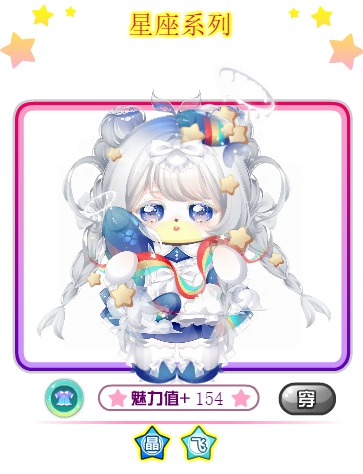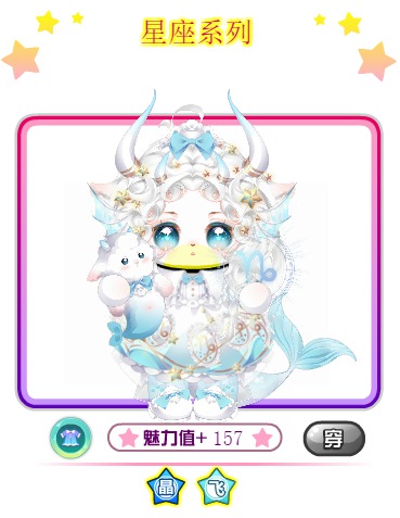 以蓝色和白色为基调,整体弥漫着淡蓝与纯白的清新雾气。一头微卷的俏皮短发,与头顶别致的星座羊角蝴蝶结相映成趣,手捧象征摩羯座的柔软云朵小羊,眼神清澈而充满好奇。