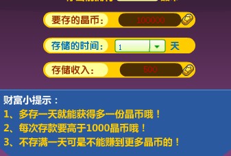然后选择你要存入的晶币,存入十万的话,一天可以多生出500晶币。虽然听起来不怎么样,不过有闲钱的小奥拉可以试看看。