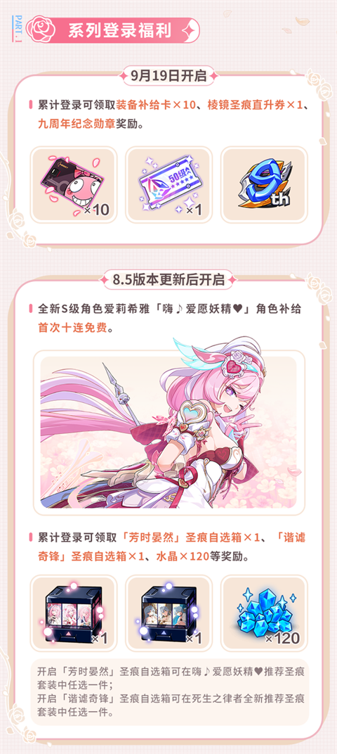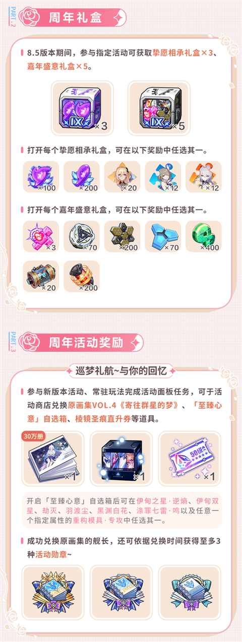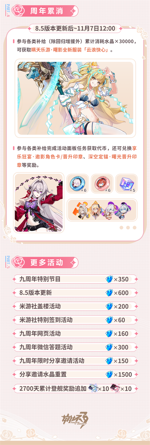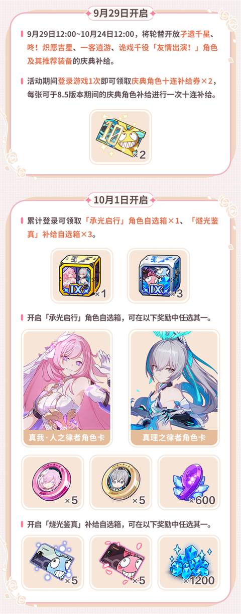 舰长好,8.5版本中将开放「周年累消」活动,活动期间参与各类补给可获取活动代币,兑换瞒天乐游·曙影全新服装「云浪快心」、享乐狂宴·邀影角色卡/晋升印章、深空定锚·曙光晋升印章、根源棱镜等奖励。此外新版本中还将开放庆典补给,活动期间登录游戏还可领取庆典角色