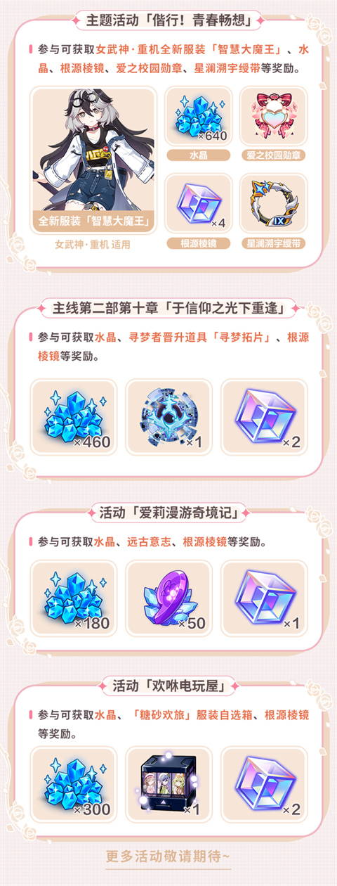 原画集Vol.4《寄往群星的梦》即将登场!8.5版本开放的「巡梦礼航~与你的回忆」活动中将放出30万册全新原画集,此外还有神之键自选箱、棱镜圣痕直升券、三分结晶等道具供舰长兑换~