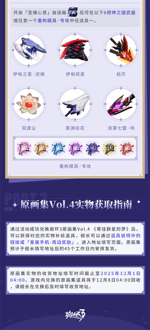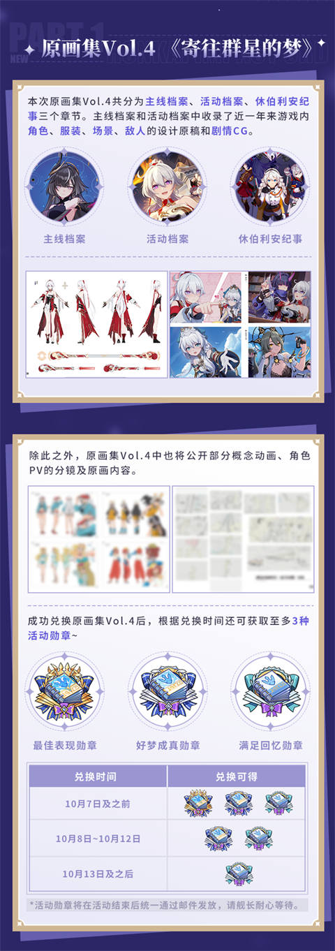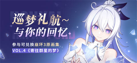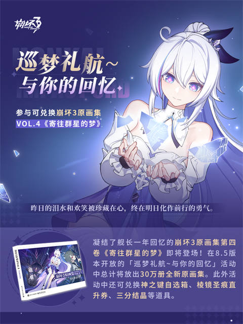 原画集Vol.4《寄往群星的梦》即将登场!8.5版本开放的「巡梦礼航~与你的回忆」活动中将放出30万册全新原画集,此外还有神之键自选箱、棱镜圣痕直升券、三分结晶等道具供舰长兑换~