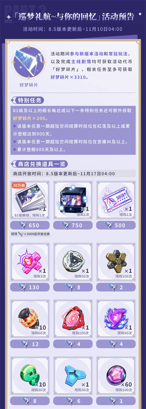 舰长好,8.5版本中将开放「周年累消」活动,活动期间参与各类补给可获取活动代币,兑换瞒天乐游·曙影全新服装「云浪快心」、享乐狂宴·邀影角色卡/晋升印章、深空定锚·曙光晋升印章、根源棱镜等奖励。此外新版本中还将开放庆典补给,活动期间登录游戏还可领取庆典角色