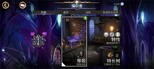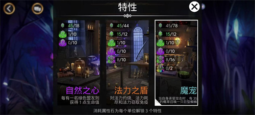 2、职业特性:职业也拥有三个特性。点击界面右侧的特性图标,你需要消耗对应的属性石来解锁它们。这些特性往往非常强力,比如编织者的特性搭配上绿色宝石为主的阵容就有奇效。