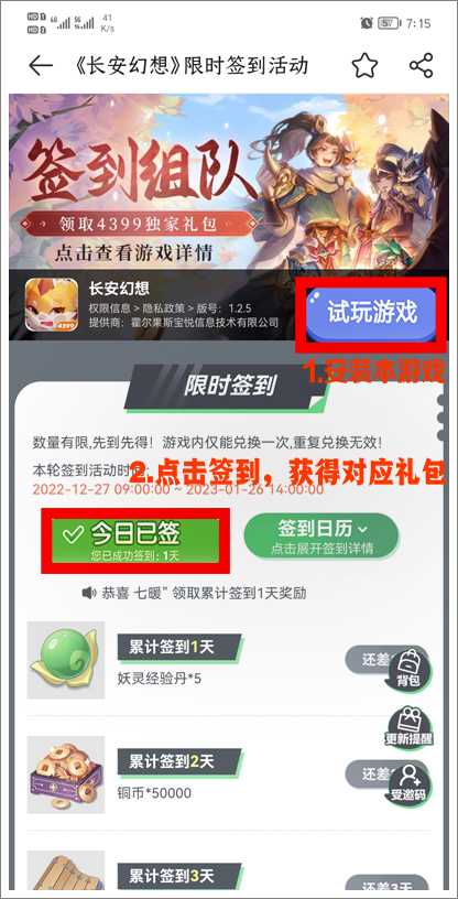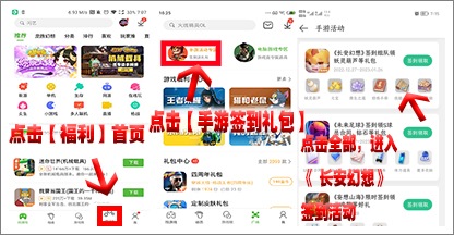 4、未安装用户下载并安装《长安幻想》,即可参与签到(已下载用户可直接更新后到活动页面参与签到);
