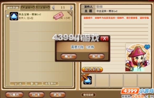 付款取信(在发送点券下面的选项):选择“付款取信”可以将邮件中的附件以付费邮件的形式发送给其他玩家,当其他玩家收取邮件中的附件时需要付出发信者设定数量的点券,点券将会通过邮件的形式发还给发信者。付款取信可设定邮件返还时间,在对方未收取附件的情况下,邮件将会在规定时间内返还给发信者。