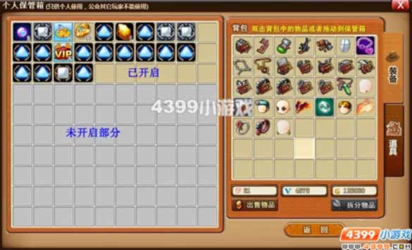 背包:显示当前玩家背包内所有物品,双击物品或是拖动物品到保管箱可以存放物品;拖动保管箱中的物品到背包中可以取出物品。