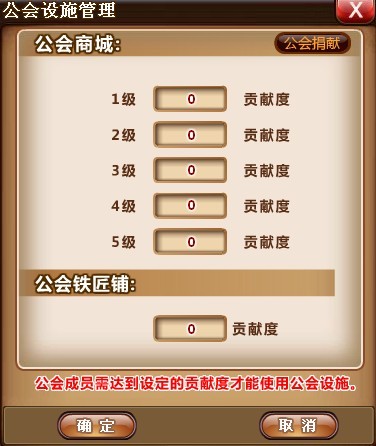 公会设施管理:所有成员都可以进入该页面查看当前公会设施的使用权限要求,只有公会会长可以更改使用权限要求。使用权限要求以贡献度为标准,贡献度的计算方式为:贡献度=捐献值+掠夺值,捐献值=任务获得公会财富+点券捐献值。