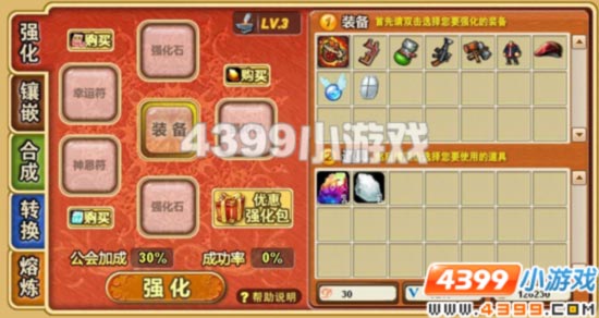 强化石4级快捷购买按钮:点击可以快捷购买强化石并放置进强化石栏。强化时使用的强化石等级越高,数量越多,强化成功率越高。