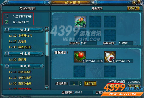 点击炼丹炉后,玩家就可以进去选择已有的药材进行提炼了。每种草药提炼出来的丹药不一样,同时玩家也需要一定的铜钱来进行加工。当选择好药材后,单击开始炼制就可以提炼仙丹了。
