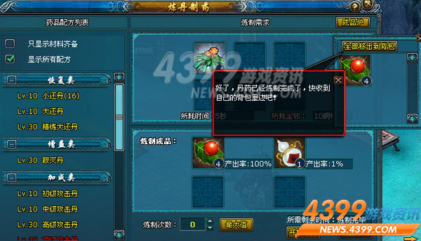 当仙丹提炼好了后,会自动存入玩家的背包,玩家要注意查收。仙丹在4399凡人修真里有着非凡的效用。例如小还丹和大还丹,玩家在战斗后通过使用这两种仙丹,就可以立刻补血,准备下一次的战斗。