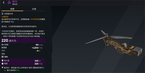 与“同轴螺旋桨”所具有的对子弹伤害50%的穿透能力不同,“主螺旋桨”则只有30%,并且从形状上来讲更容易被击中了。而“蜂鸟”的技能效果是很直观的耐久度提升:“激活时,增加直升机上所有其他‘蜂鸟’螺旋桨的耐久5%,最大加成至25%。”这个技能在一定程度上能够弥补“蜂鸟”的缺陷,但还不够。