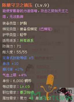 除了攻击利器,新上线的“陈塘守卫之镇压”护腕专门为喜欢赤手空拳搏斗的英雄设计。穿戴上此护腕能使穿戴者的力道倍增,攻击之势如天王铁塔,凡人无法抵御。最重要的是穿戴后,定身式技能等级将会有5的加成,同时身法也有10的加成,躲闪率也将提高2%。攻击迅速,躲闪敏捷,英雄还何愁不是天下无敌?