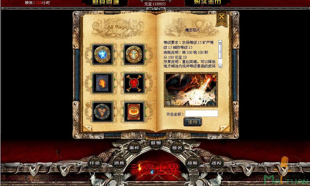作为《神鬼世界》的招牌系统之一,法术系统一直被很多玩家所关注。所谓的法术系统,就是玩家通过消耗一定数量的基础资源之后,可以使用各种法术直接攻击地图上任意一个玩家,而且是即时性无视免战的攻击。神族和鬼族都有着各自不同的法术,但是所有的法术又统一的归为三大类别,分别是防御类,控制类和破坏类。防御类法术是玩家对自己的城池施展的法术,可以抵消一次敌人的法术攻击。控制类法术的作用是可以让对方在一定的时间内无法征兵或者无法出征,禁止相关的军事行为。攻击类的法术则主要是用破坏对方城池的各种属性的法术,如果在资源充沛的条件下,几十名玩家同时对一个城池使用多攻击性法术,可以轻易的将城池打到初级。
