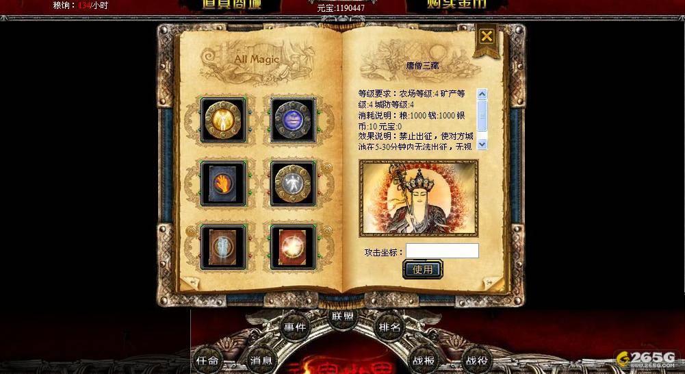 从以上的资料大家可以看出,就如同之前官方宣传的一样,所有的技能可以归为四个大类,分别是:防御类,攻击类,控制类和偷盗类。其中防御类法术设定成1级就可以使用,是为了避免初级玩家被老玩家用法术恶意攻击。之后可以掌握的控制类技能唐僧三藏虽然诈看起来没有太大效果,但是如果几个玩家同时使用的话,会把目标活活困死在家中,活用起来效果也是不可忽视的。偷盗类属于比较无赖的技能,不但可以偷取资源之外,还有一定概率可以偷到一些玩家冲值的金币。但是官方表示,冲值的玩家也不用担心,这个技能有成功率和金币上限的限制,不会让玩家被偷的一贫如洗,只是为了增加一些游戏里的紧张感和刺激感。最后,说到攻击类的法术,应该是玩家们日常最常用和最关心的。神族的几个技能都比较实用,可以帮助玩家有效的打击对方的城市防御和发展度,而且如来神掌更是可以群杀对方的英雄,要知道,在游戏里如果英雄如果阵亡的话,就不可以执行任何任务,而且每次复活的时候都会根据英雄等级的高低来消耗不同数量的银币,如果同时把对方5名60级的英雄杀死的话,对方至少需要消耗将近300的银币才能使这几名英雄复活。