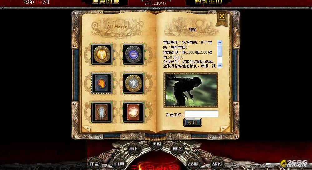 效果说明:盗取目标城池的粮食,库银,银币,守兵和金币中某一项的资源,无视免战状态,有几率失败。