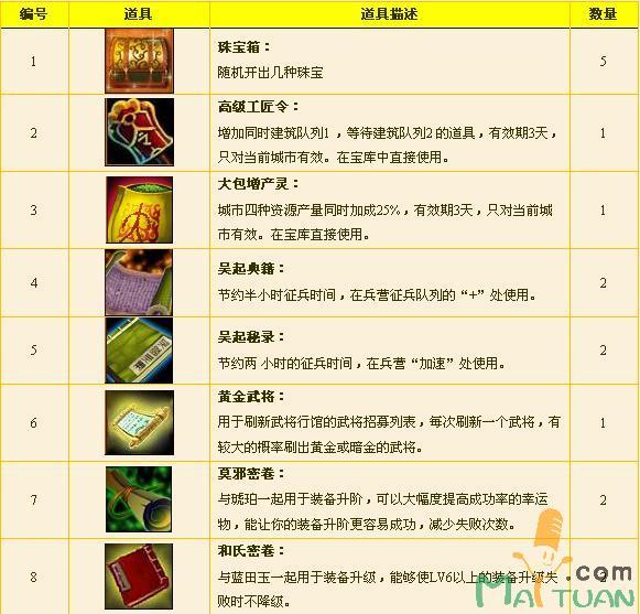将军礼包:当君主声望到10000,爵位为大将军,即可打开将军礼包,可获得各类打造道具,让您所向披靡!