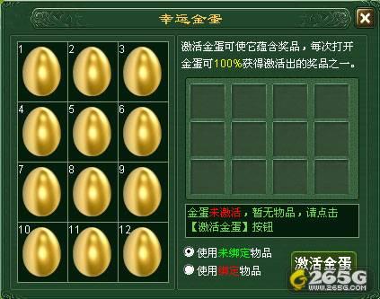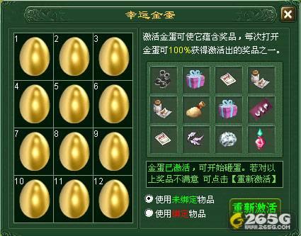 然后,点击“激活金蛋”消耗一个道具“金鸡”即可成功激活金蛋,此时右侧栏所展示出的物品就是你可能获得的物品。如果对展示出的物品不满意,可以点击“重新激活”再消耗一个“金鸡”,此时展示物品将会刷新一次,因此完全可以刷出你想要的物品再动手开始砸蛋也不迟。