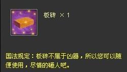 通常意义上,板砖除了建筑用途外,它的主要意义在于砸人。请注意金色字体:板砖不属于凶器,所以您可以随意使用,尽情砸人吧。当选择好了要砸的对象,就放心大胆的将它扔出去吧。至于效果,还是让我们一起来看看下面的截图。