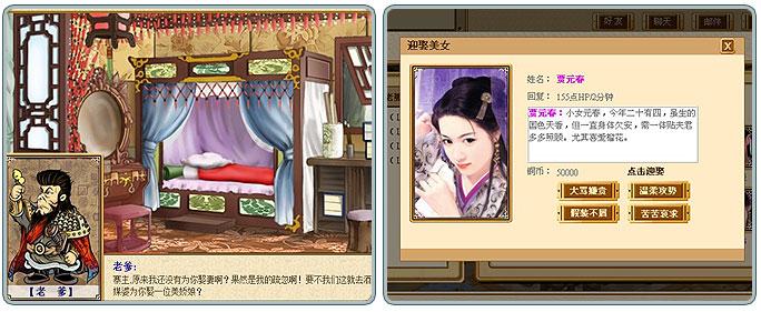 《水浒战略》的游历系统,其实就是一个标准的内置RPG游戏,将领作为RPG主角可以做任务,其战斗模式也是标准的回合制战斗。将领可以在游历中获得经验值、获得装备道具,让将领慢慢成长。这样成长起来的将领可以更好的发挥麾下军队的能力。自身的武将也增加了比较多的游戏性:在家呆腻了能够出去游历一下,在游历可能还会遇到一些稀奇古怪的事情,也可以回山寨修炼自己的实力,也可以训练手下的喽喽们,训练喽喽的画面也比较巧妙的加上了flash动画演示,还算比较独特。武将的娶妻系统也让玩家不再孤单,妻子除了做各种饭菜,履行其义务外,可以让你得到随机的道具并且恢复HP,培养与妻子的好感度还可以增加生育宝宝的几率,历史美女以及各种巧妙的语言对话的结合让游戏具有趣味化和生活化。据说正式公测的版本在娶妻系统上还有更多的完善,希望能够给大家带来更多的乐趣吧。