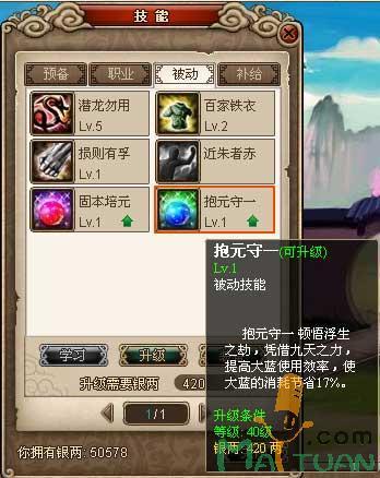 所谓“抱元守一”:顿悟浮生之劫,凭借九天之力,提高大蓝使用效率,会依据不同的技能等级使大蓝的消耗节省不同的比例。