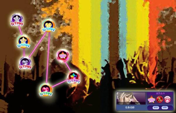 据介绍,此次《任务地图》版本用多张别有特色的图形化展示全然包装每一个任务环节。无论是引导任务、主线任务、支线任务等,玩家对任务的接受、执行等环节变得直观而生动。尤其是随着《巨星》本身明星资源的丰富,一些以明星命名的诸如“Michael Jackson任务”、“周杰伦任务”、“王菲任务”等任务设计,一定带给不同喜欢唱歌的玩家无限惊喜。另外,对于任务执行中固定、随机赠送AVATAR等限量道具的设定,也保证了每个玩家在玩尽兴的同时,体验丰厚奖励的刺激!