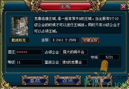 占领王城后,公会会长就将成为该王城的国王,并且获得该城的神器,拥有超凡属性的神器可是比7属性紫装还要NB的装备喔!你不想拥有么?而且王城还能给予公会成员巨大的帮助喔!