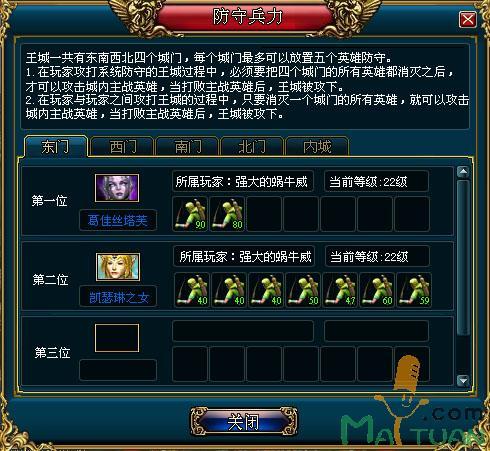王城一共有东南西北四个城门,每个城门最多可以放置五个英雄防守。内城只能放一个英雄防守。在玩家攻打系统防守的王城过程中,必须要把四个城门的所有英雄都消灭之后,才可以攻击城内主战英雄,当打败主战英雄后,王城被攻下。在玩家与玩家之间攻打王城的过程中,只要消灭一个城门的所有英雄,就可以攻击城内主战英雄,当打败主战英雄后,王城被攻下。