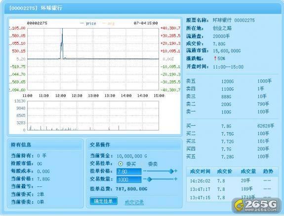 玩家进入游戏股市列表中会首先看到股票的分析图,有蓝色线和红色线两条线组成的走势图。蓝色的线代表该股票走势分析,红色的线代表该股票的均价。玩家可以通过这个分析图很清晰的看到股票在每个时间段内的价格走势以及跌涨情况。