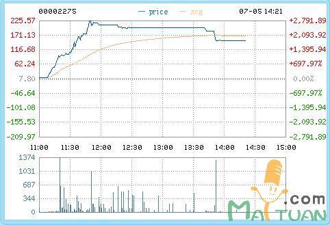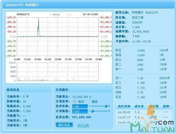 玩家进入游戏股市列表中会首先看到股票的分析图,有蓝色线和红色线两条线组成的走势图。蓝色的线代表该股票走势分析,红色的线代表该股票的均价。玩家可以通过这个分析图很清晰的看到股票在每个时间段内的价格走势以及跌涨情况。