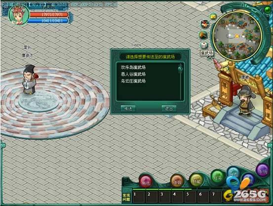 通过点击游戏界面右上方微型地图旁的演武场快捷按钮可以打开演武场选择界面,目前游戏中设置了欢乐岛演武场、恶人谷演武场、乌云庄演武场,选择任意一个演武场,系统就会将你传送到该演武场地图中。