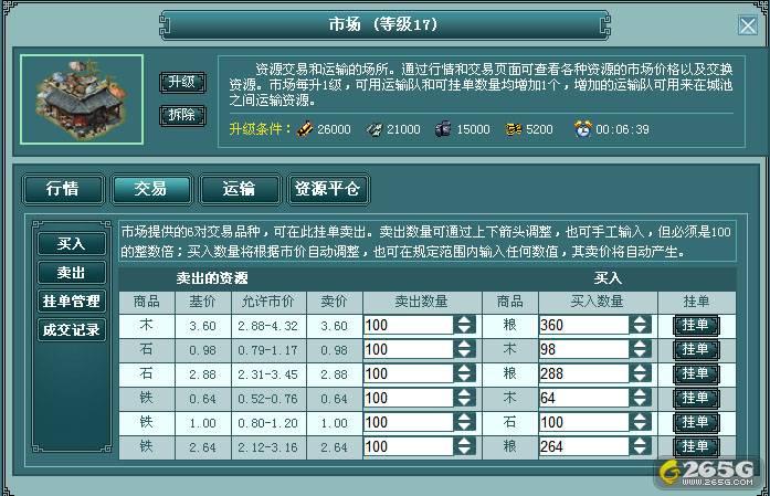 资源市场,成就军火商:《江山》独特的资源模型与独特的市场交易规则,给玩家带来全新的市场体验。《江山》市场运作采用了类似证券交易的形式,《江山》为玩家提供了六对资源交易方式。价格比会在系统给定的范围内因交易量而上下波动。