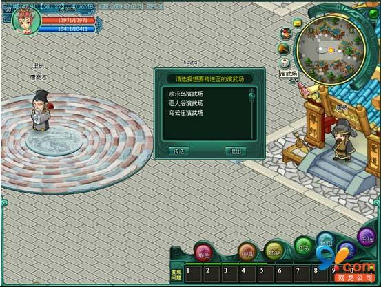 通过点击游戏界面右上方微型地图旁的演武场快捷按钮可以打开演武场选择界面,目前游戏中设置了欢乐岛演武场、恶人谷演武场、乌云庄演武场,选择任意一个演武场,系统就会将你传送到该演武场地图中。