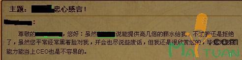尊敬的领导:你好,虽然某公司说能提供高几倍的薪水给我,不过我还是拒绝了,虽然您平常经常黑着脸对我,开会也尽说些废话,但我还是很欣赏你的,毕竟凭您的能力能当上CEO也是不容易的。