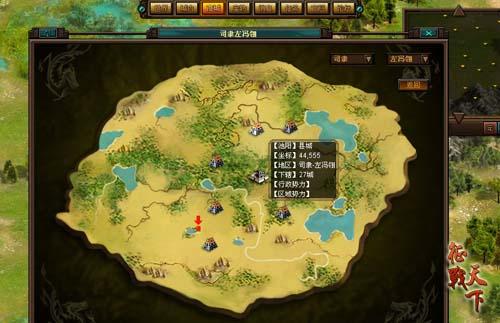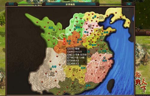 点击顶端功能栏的“世界”,则能俯瞰整个汉末三国地图。利用套用其中的区域地图功能,你可以找到你所在的郡县与城池。当然秉承务实原则的地图功能不会只是优美画面那么简单,其中还包含着传说中的“势力系统”哦!你可以针对县城搜索其势力分布,还可以直接定位县城位置,为攻打县城名将抓捕提供方便。