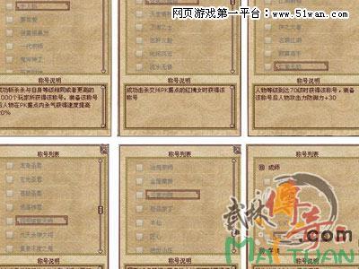 在网页游戏《武林传奇》里,你不管是专心经营家园的一个山野散人,还是一个浪迹天下的独行侠士,或者是为民除害的江湖义士,或是桃李满天下的一代宗师,或者只是一名神兵宝具的锻造工匠,甚至是富甲一方的钻石王老五,只有你参与到游戏中去并产生自己的成就,就能获得玩家们的认可,得到一系列的称号。这些称号,有的可以给你增加自身属性BUFF,有的能给自己的角色头像增加状态特效,甚至有的仅仅只能用于观赏或者收藏,但都是你的传奇证明,也是你自己传奇中的一个个脚印。