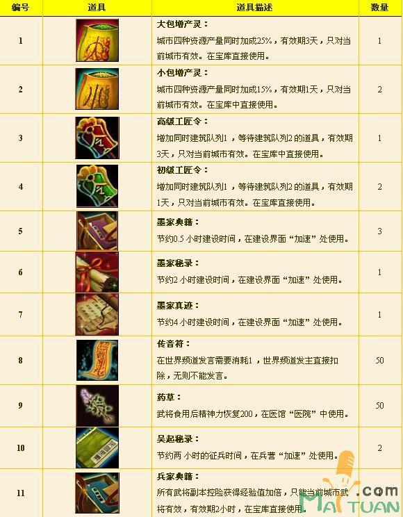将军礼包:当君主声望到10000,爵位为大将军,即可打开将军礼包,可获得各类打造道具,让您所向披靡!