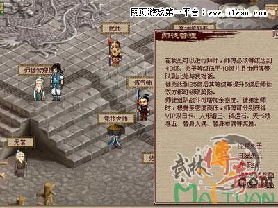 当你初次踏入《武林传奇》的世界,一切都是那么的新奇,对于一个新人,一头扎进武侠的江湖世界,享受探索的乐趣,固然是一件很快乐的事,不过也难免遇到一些自己解决不了的问题,我想换套好点的装备可是没有钱买,任务下一步该怎么做?等等等等,如果能有一个人,可以完全信任他,请他为你答疑解惑,给你指点迷途,那《武林传奇》的旅程就会省去一些坎坷,多一些轻松的回忆,同时也多了一个朋友,作为师傅的玩家将负担起提携新人的责任。例如向徒弟传授游戏常识,帮助徒弟解决游戏中遇到的各种困难,给徒弟一些经济物质上的支持等。