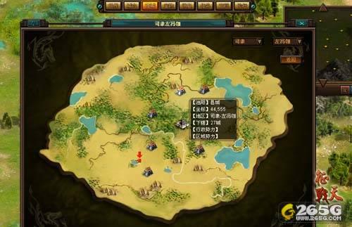 点击顶端功能栏的“世界”,则能俯瞰整个汉末三国地图。利用套用其中的区域地图功能,你可以找到你所在的郡县与城池。当然秉承务实原则的地图功能不会只是优美画面那么简单,其中还包含着传说中的“势力系统”哦!你可以针对县城搜索其势力分布,还可以直接定位县城位置,为攻打县城名将抓捕提供方便。
